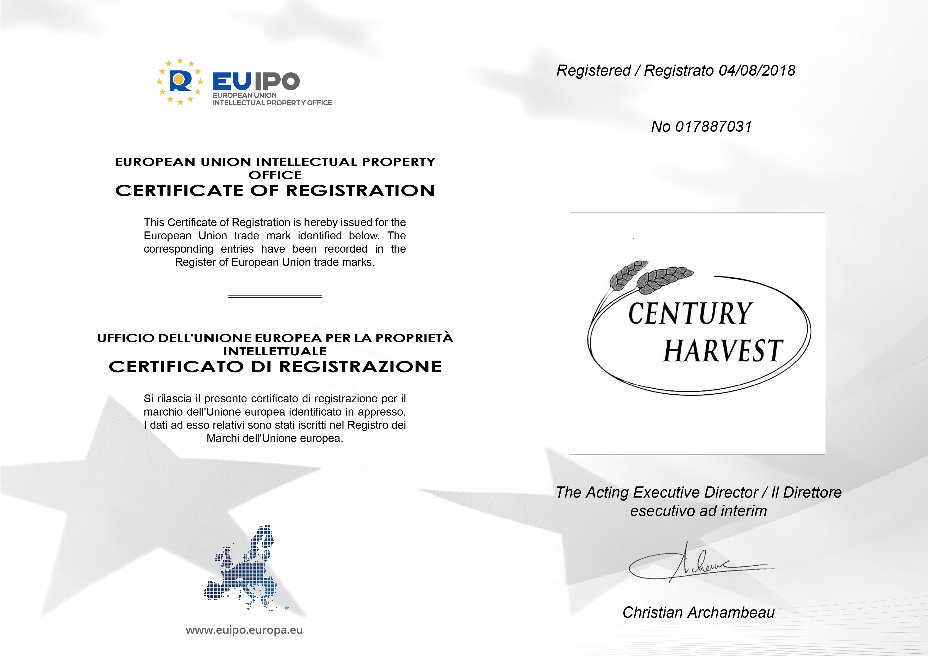 公司品牌“CENTURY HARVEST世紀怡豐”于近日通過歐盟商標注冊局核準,這也標志著公司知識產權管理工作又向前跨進了一步,也使得公司能夠更好地進行知識產權...