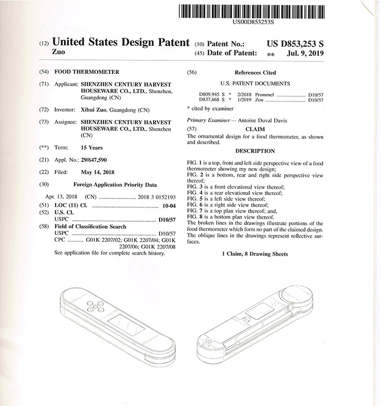 深圳市深新暉電子有限公司一直秉持“創新、高效、和諧、誠信”的企業精神,始終把創新放在首位,近年來取得了飛速的發展。CH-209也成功獲得了美國外觀專利的授權。折疊食物溫度計 (...