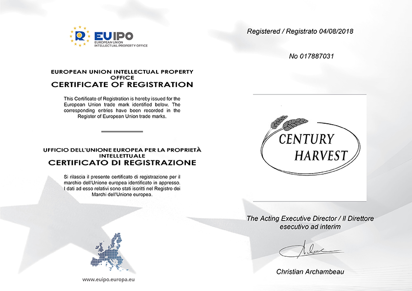 公司品牌“CENTURY HARVEST世紀怡豐”于近日通過歐盟商標注冊局核準,這也標志著公司知識產權管理工作又向前跨進了一步,也使得公司能夠更好地進行知識產權管理和應用,切實進行知識產權保護工作。